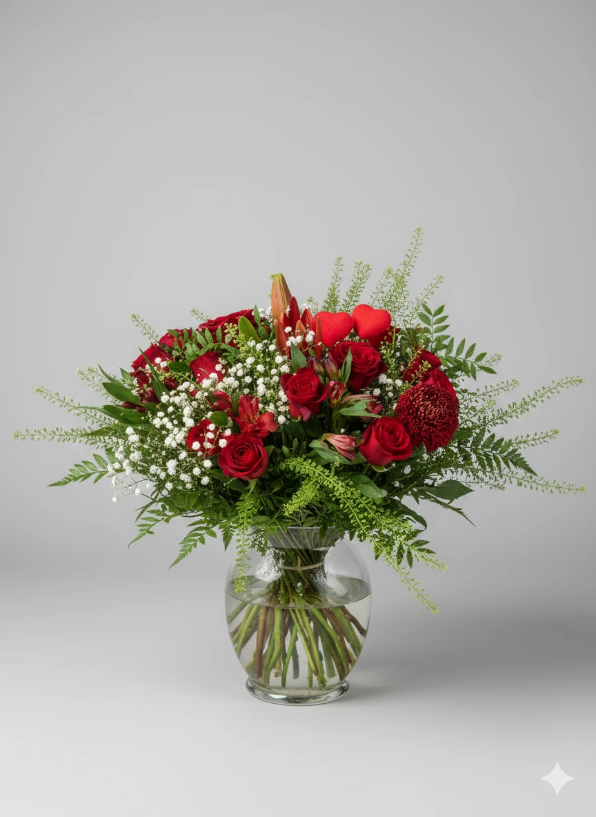 D’un diamètre de 45 cm, cette composition allie élégance et générosité : des fleurs rouges éclatantes, des touches blanches légères et un feuillage délicat qui encadre l’ensemble avec harmonie. Disposé dans un vase transparent, il illumine la pièce de sa présence et invite à la contemplation.
