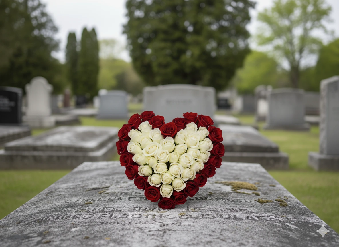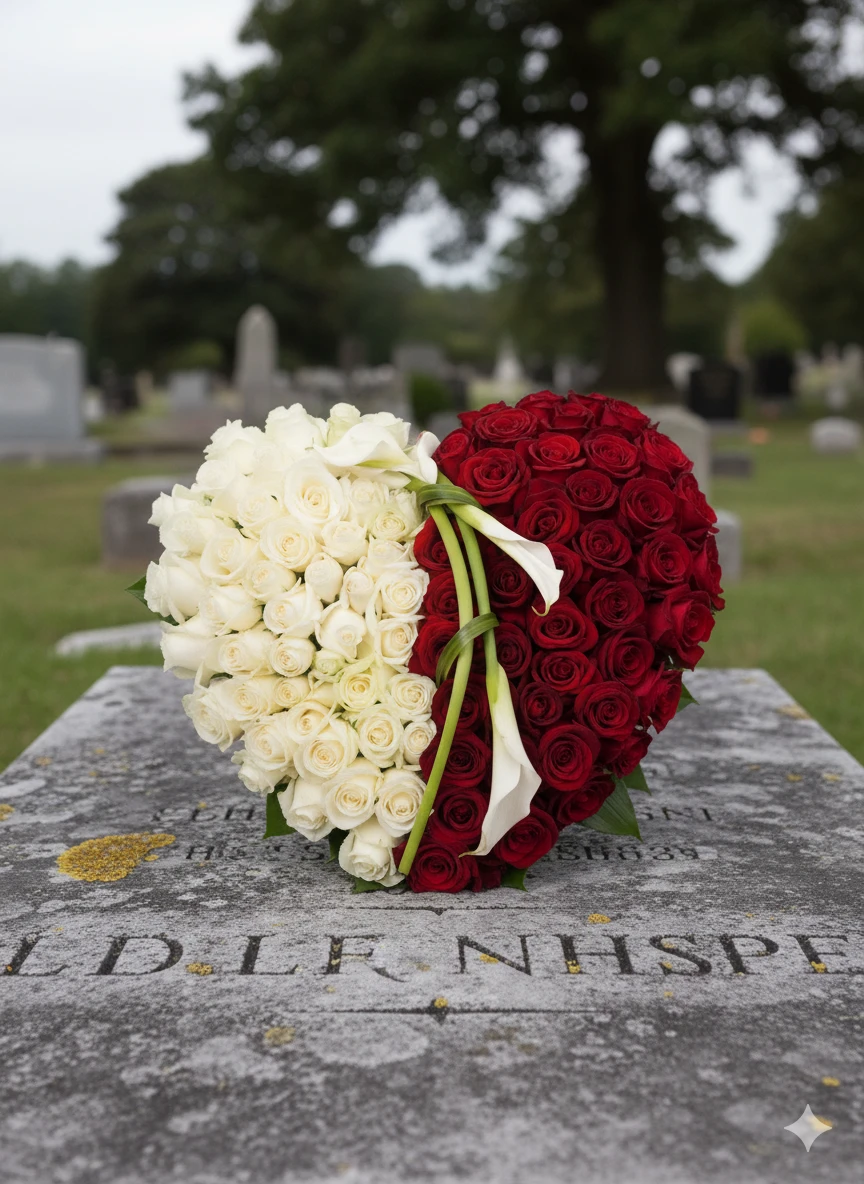 Les fleurs blanches et pastel rappellent la tendresse des souvenirs, tandis que les tons rouges traduisent la profondeur de l’amour et du respect.